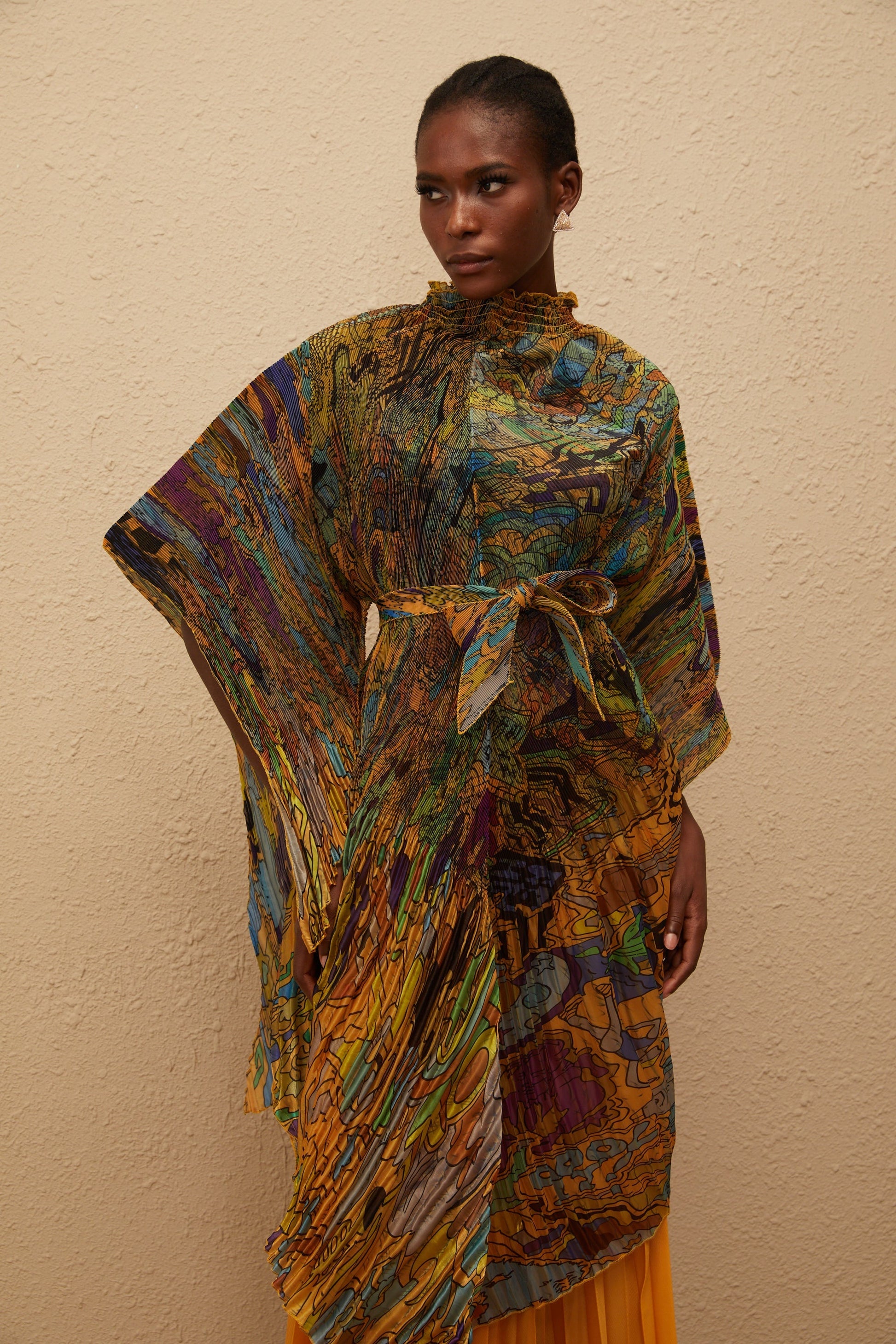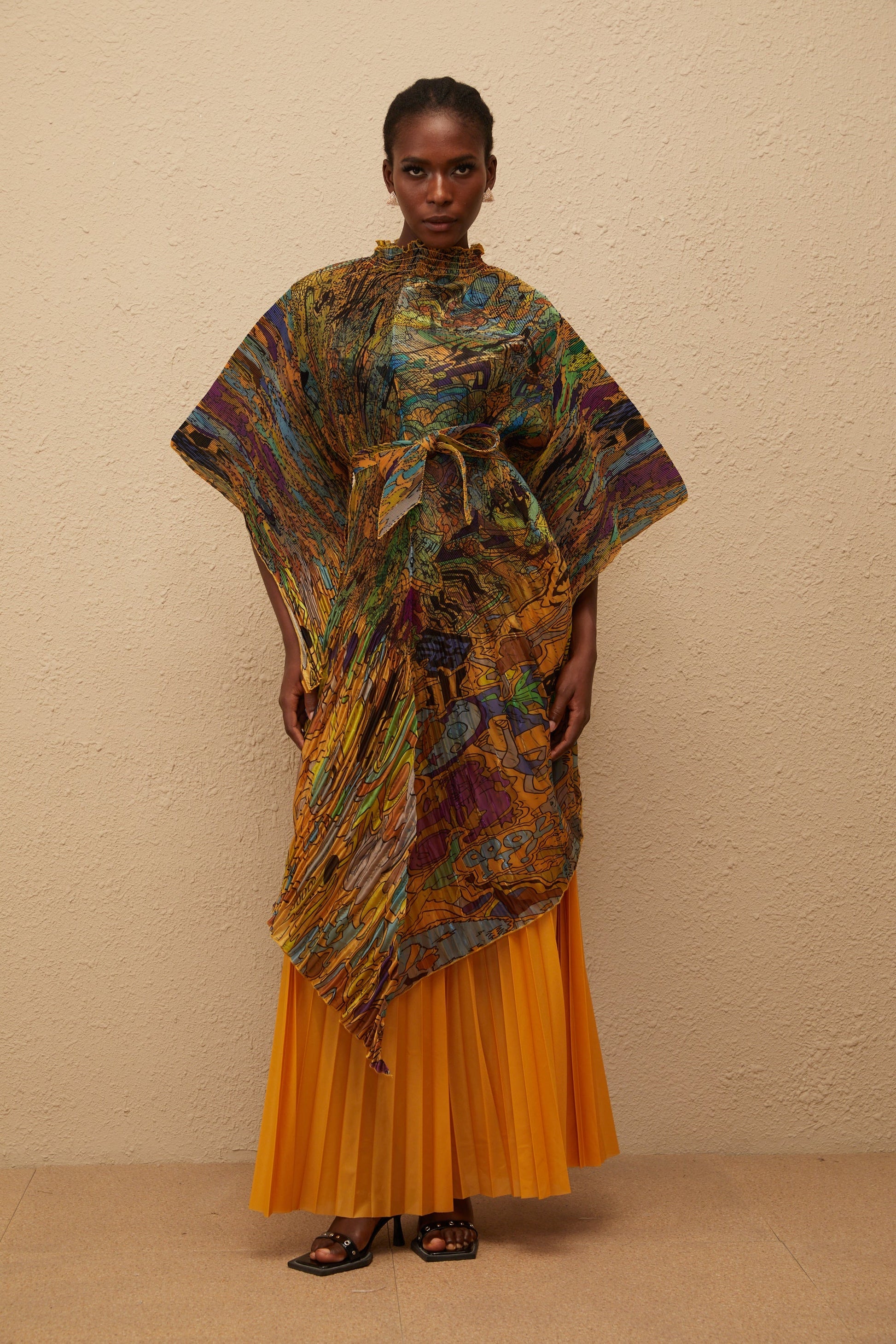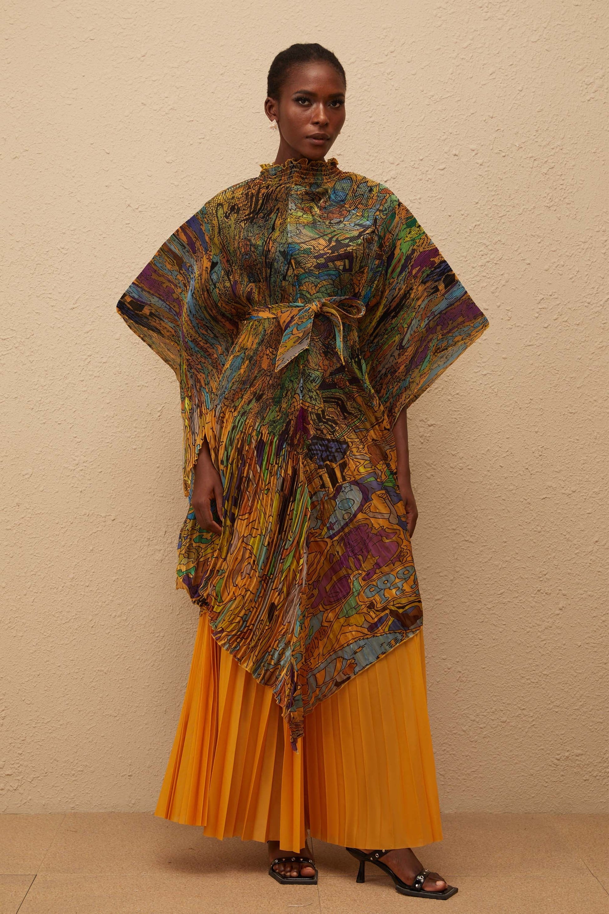 Bluz• Model 1.77 m boyunda ve M beden giyiyor• Zencefil/Çok Renkli• Fırfırlı boyun• Yarasa kollu• Bağcıklı bel• Desen baskısı• Pileli detaylar• Pelerin tasarımı• Asimetrik etek ucu• Kompozisyon: %100 Terilen elyafPantolon• Model 1.77 m boyunda ve M beden giyiyor• Zencefil• Geniş bacak• Pileli detaylar• Uzun uzunluk• Kompozisyon: %100 Terilen elyaf