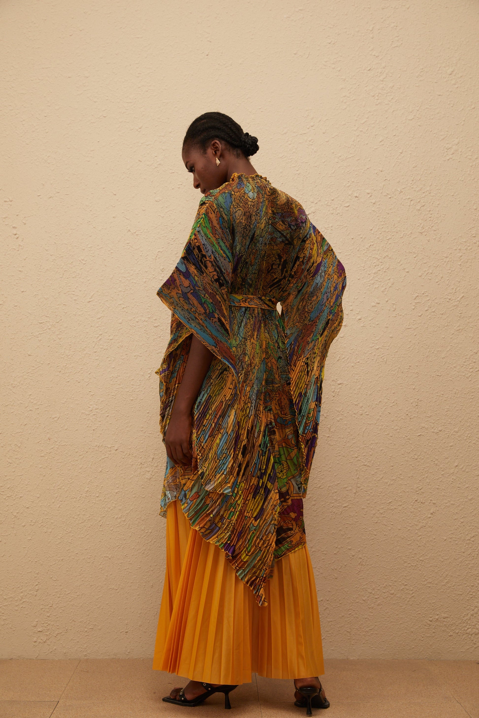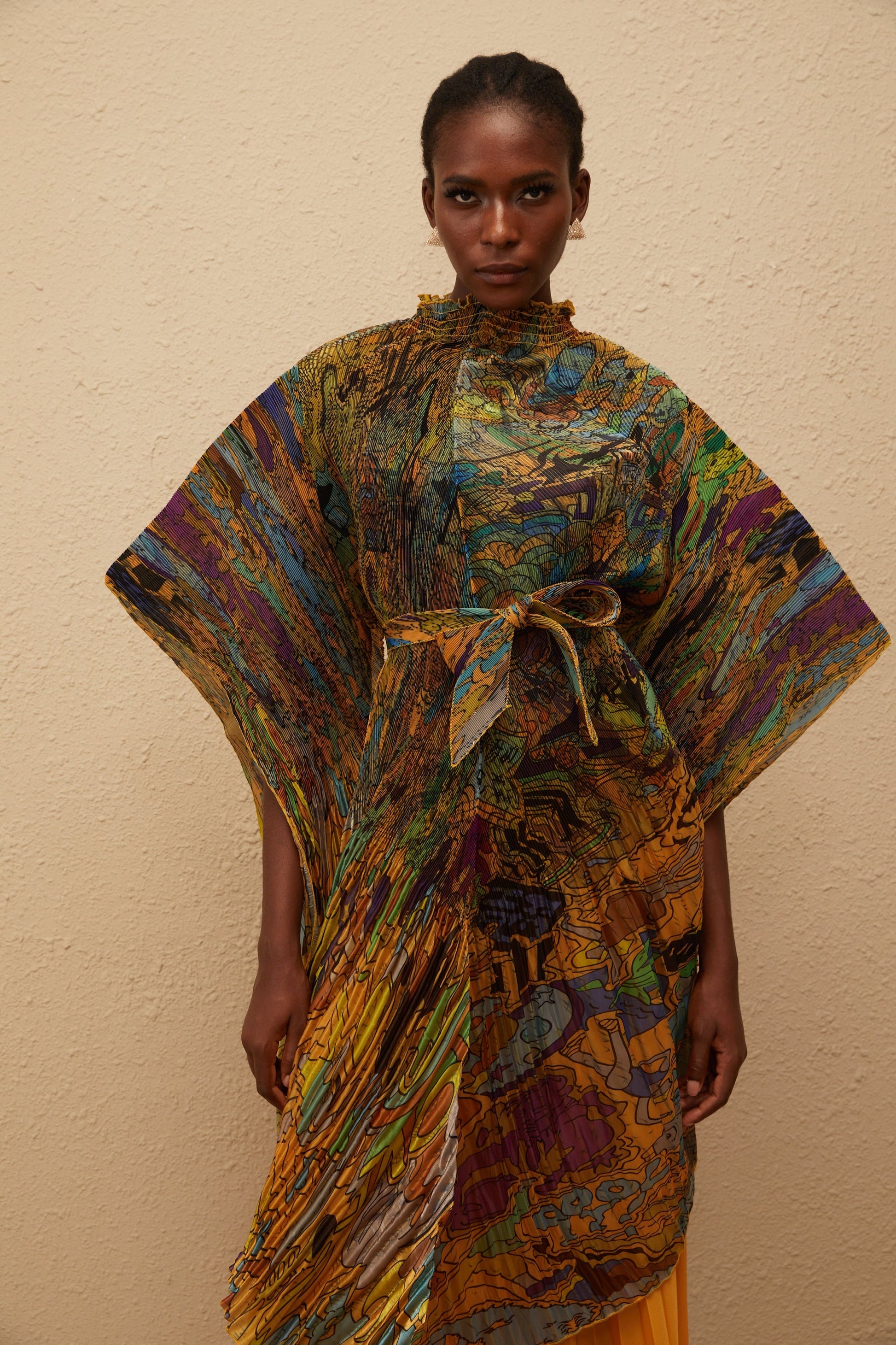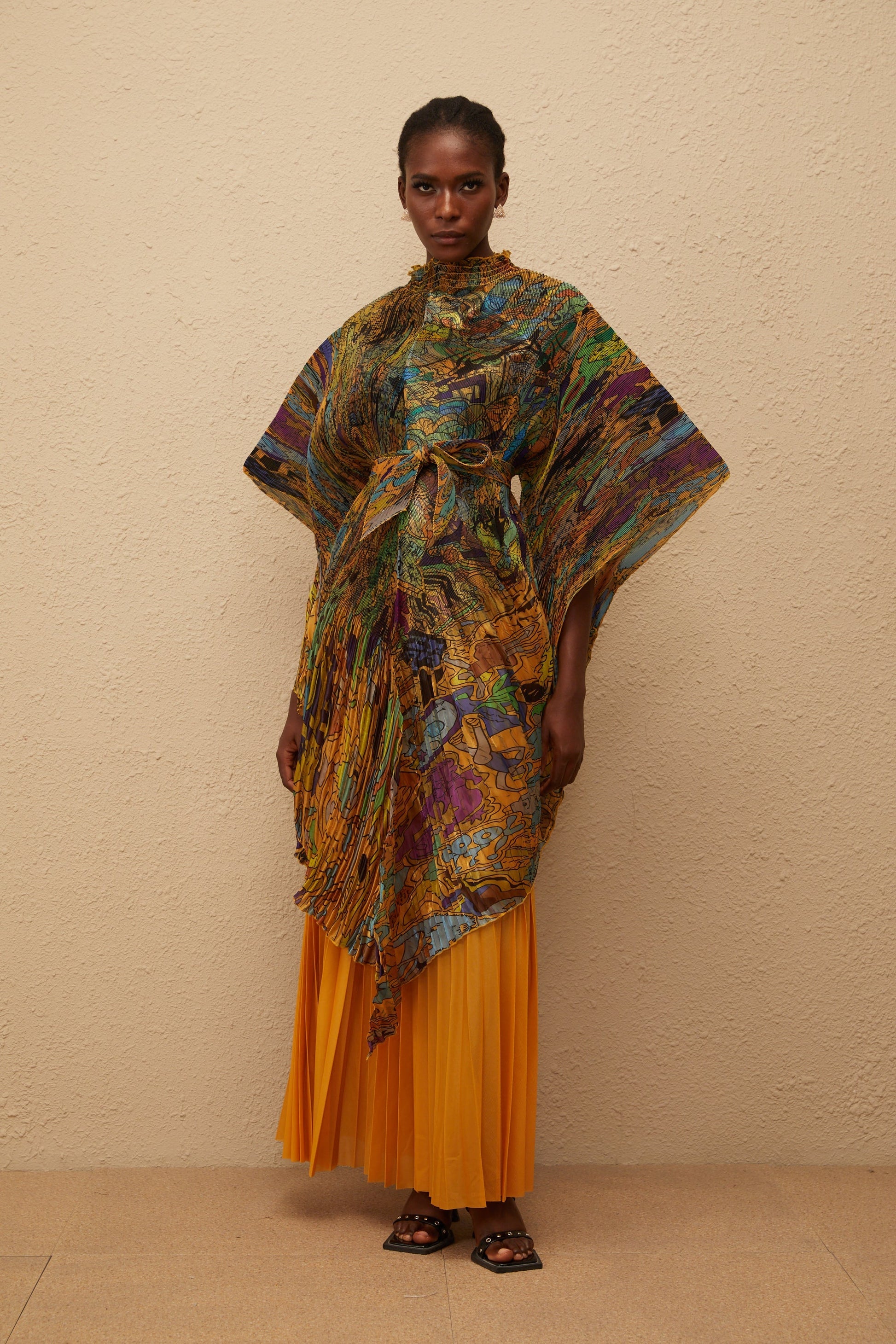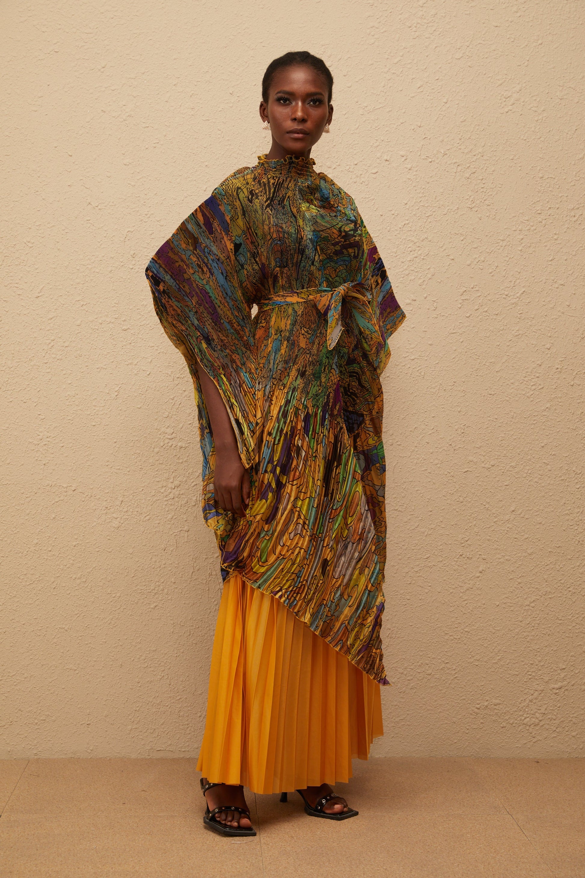 Bluz• Model 1.77 m boyunda ve M beden giyiyor• Zencefil/Çok Renkli• Fırfırlı boyun• Yarasa kollu• Bağcıklı bel• Desen baskısı• Pileli detaylar• Pelerin tasarımı• Asimetrik etek ucu• Kompozisyon: %100 Terilen elyafPantolon• Model 1.77 m boyunda ve M beden giyiyor• Zencefil• Geniş bacak• Pileli detaylar• Uzun uzunluk• Kompozisyon: %100 Terilen elyaf