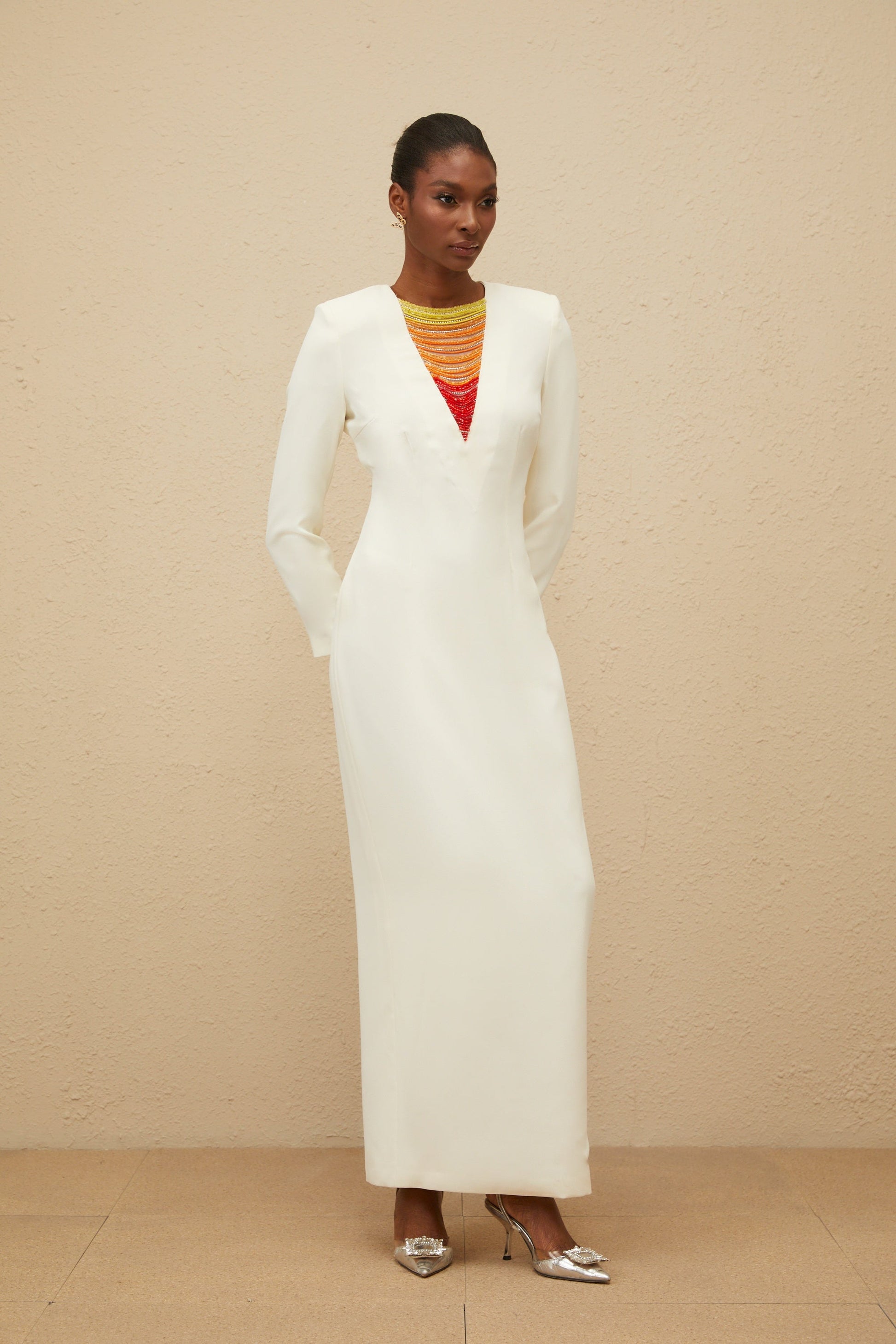 Rosée Beyaz Yapay Elmas Boncuklarla Süslenmiş Uzun Elbise