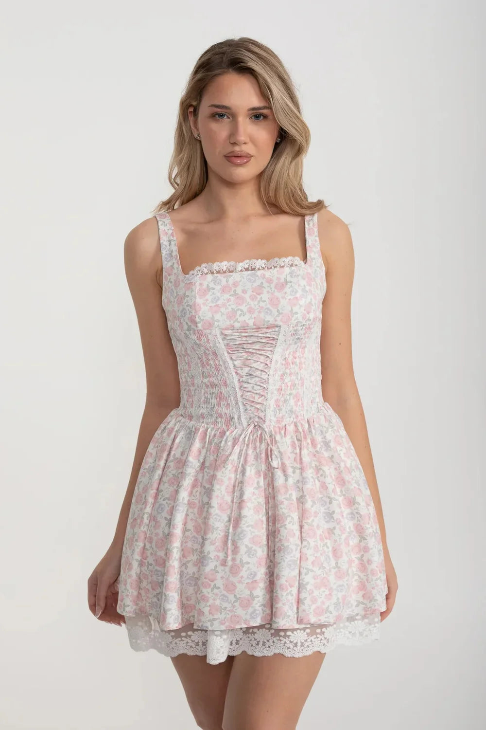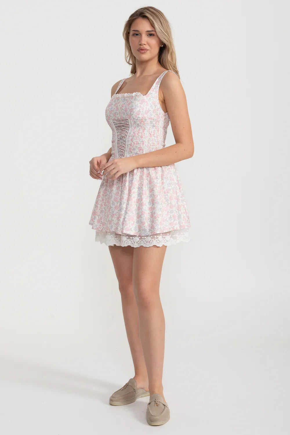 Pembe Çiçek Desenli ve Önü Bağcıklı Detaylara Sahip Kolsuz Yazlık Elbise - Beyaz