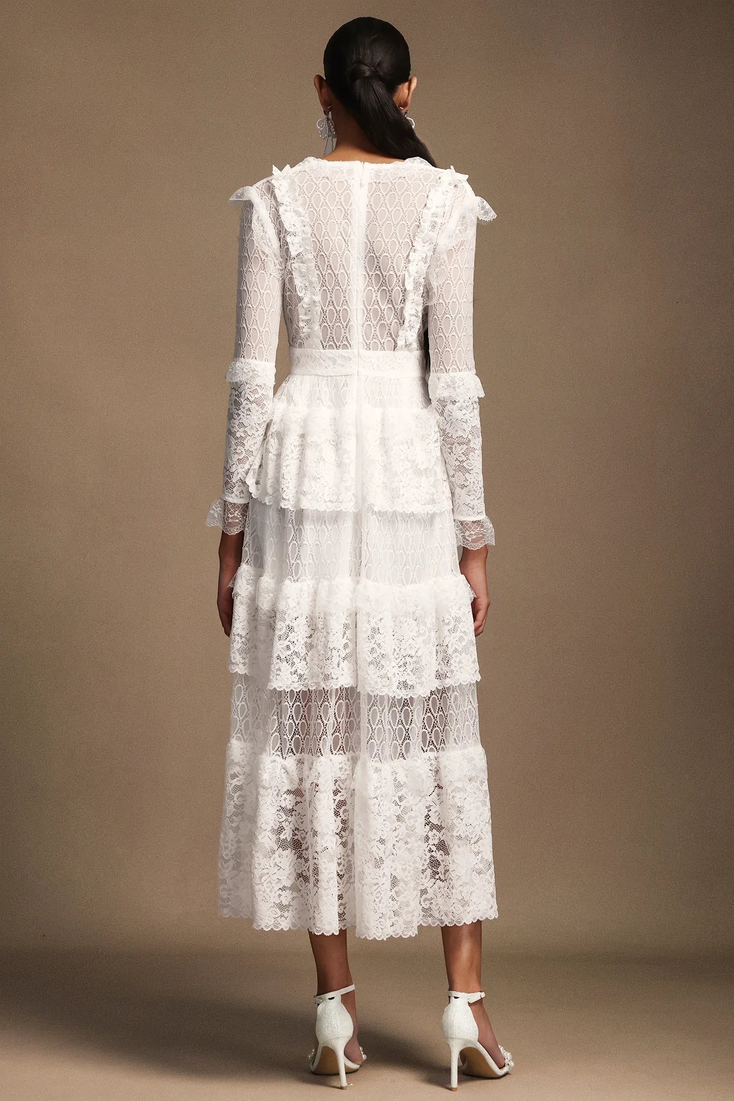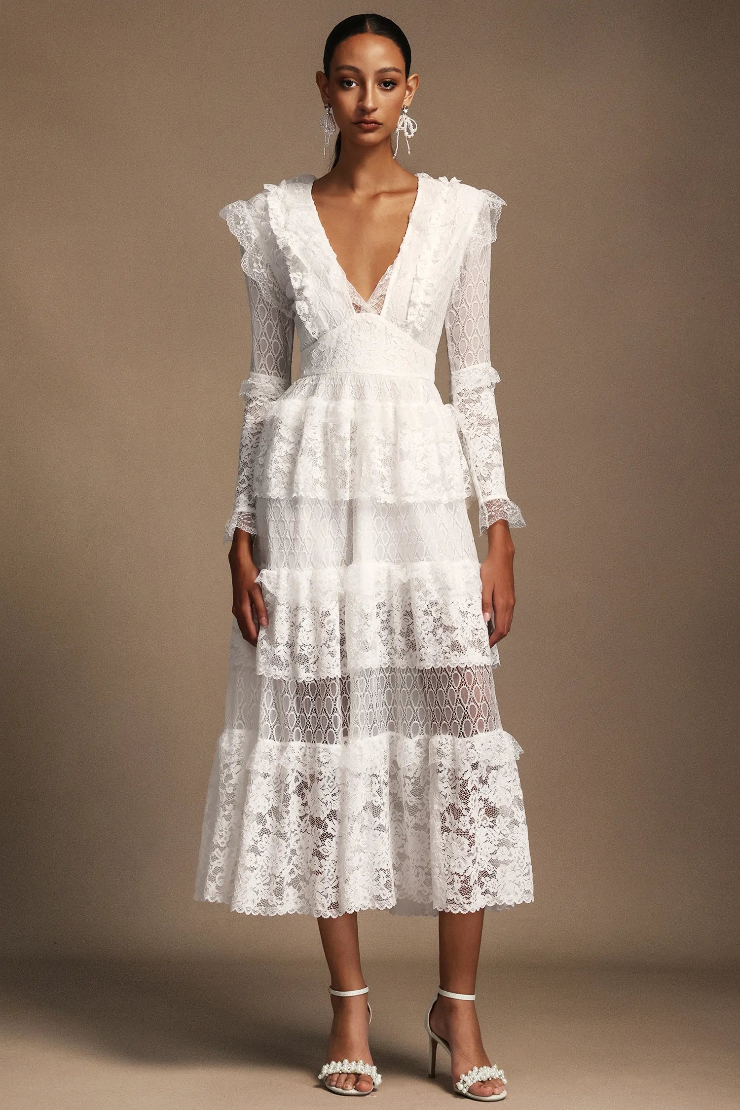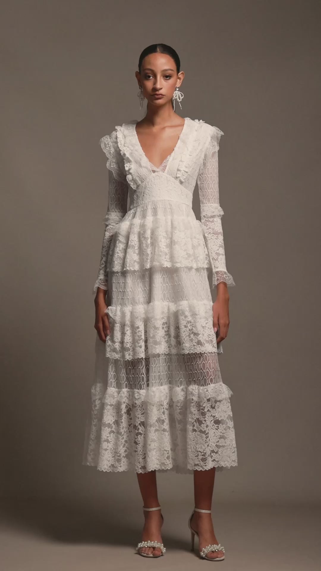 Solvia V Yaka Uzun Kollu Katmanlı Dantel Midi Elbise