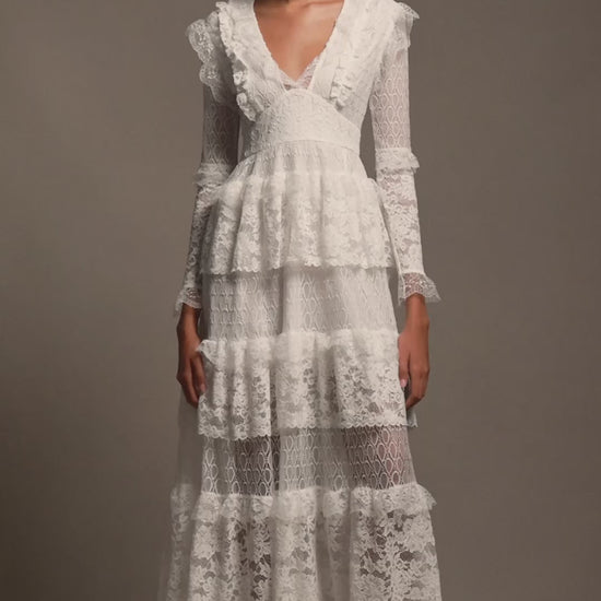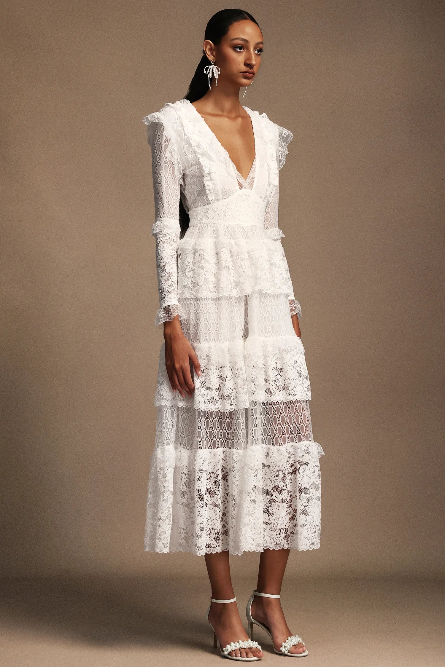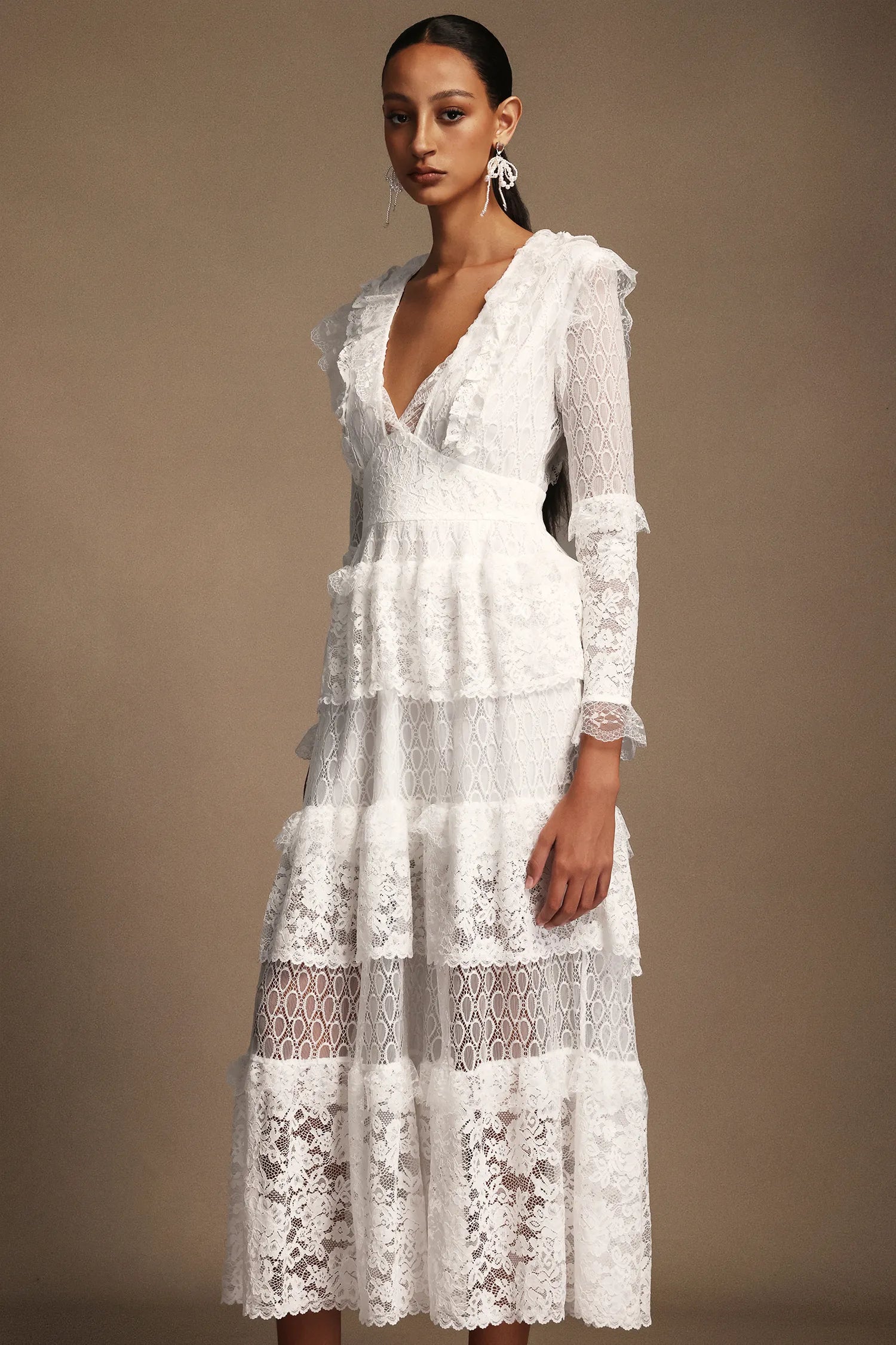 Solvia V Yaka Uzun Kollu Katmanlı Dantel Midi Elbise