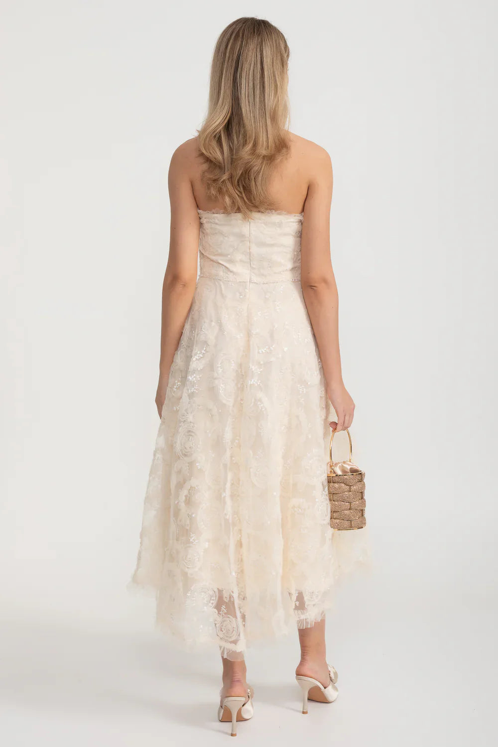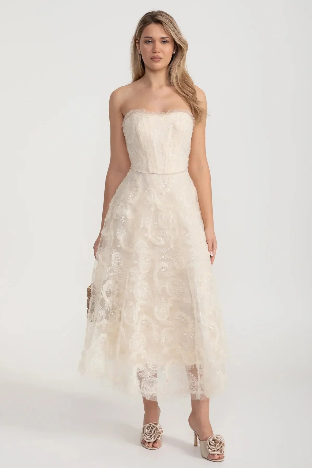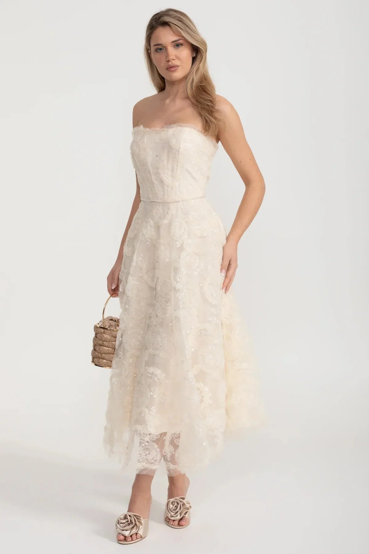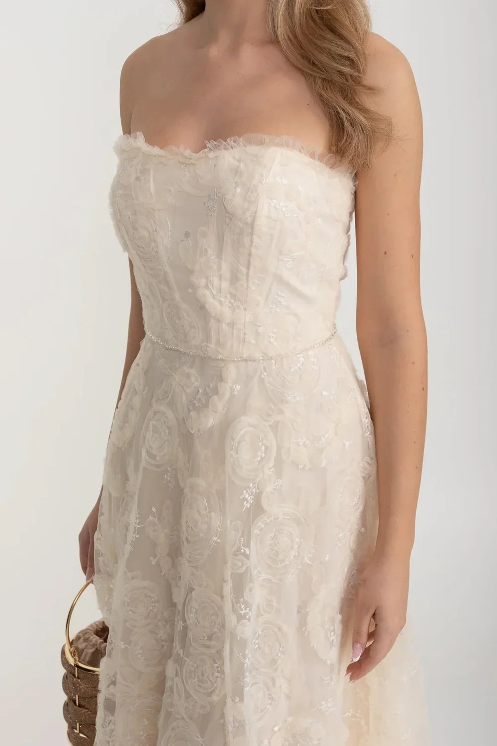Straplez Dantel Elbise, Dar Korse ve Çiçek Motifli - Fildiş